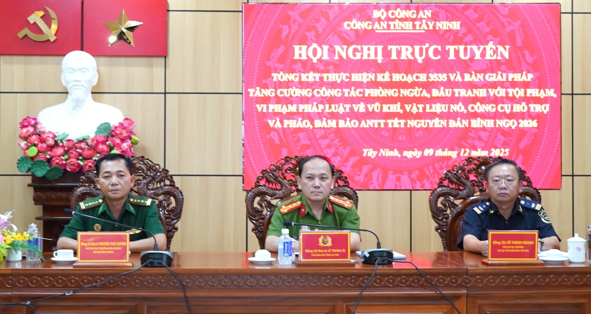 Chiều ngày 09/12/2025, Cục Cảnh sát quản lý hành chính về trật tự xã hội (QLHC về TTXH) – Bộ Công an đã phối hợp với Cục Phòng chống ma túy và tội phạm - Bộ Tư lệnh Bộ đội Biên phòng, Chi cục Điều tra chống buôn lậu - Cục Hải quan tổ chức Hội nghị trực tuyến tổng kết 02 năm triển khai thực hiện Kế hoạch 3535 về phối hợp phòng ngừa, đấu tranh với tội phạm mua bán, vận chuyển trái phép vũ khí, vật liệu nổ, công cụ hỗ trợ và pháo trên tuyến biên giới; đồng thời, quán triệt những nhiệm vụ theo chỉ đạo của lãnh đạo Bộ Công an về tăng cường công tác phòng ngừa, đấu tranh với tội phạm, vi phạm pháp luật về vũ khí, vật liệu nổ, công cụ hỗ trợ và pháo, góp phần đảm bảo an ninh, trật tự Tết Nguyên đán Bính Ngọ 2026 và bảo vệ tuyệt đối an toàn Đại hội đại biểu toàn quốc lần thứ XIV của Đảng.