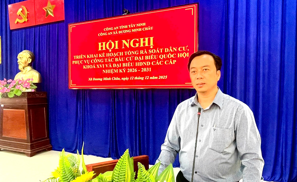 Ngày 12/12/2025, Công an xã Dương Minh Châu tổ chức Hội nghị triển khai kế hoạch, tổng rà soát dân cư phục vụ bầu cử Quốc hội khóa XVI và HĐND các cấp nhiệm kỳ 2026-2031.