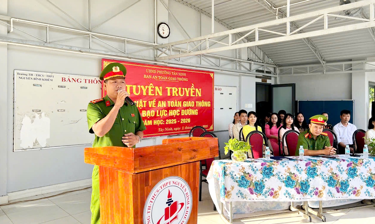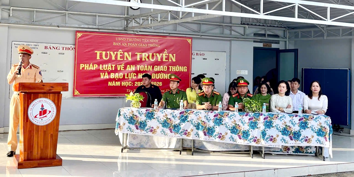 Ngày 15/12/2025, Công an phường Tân Ninh phối hợp Phòng Cảnh sát giao thông Công an tỉnh Tây Ninh tổ chức tuyên truyền pháp luật về trật tự an toàn giao thông và phòng, chống bạo lực học đường cho học sinh Trường THPT Nguyễn Bỉnh Khiêm.