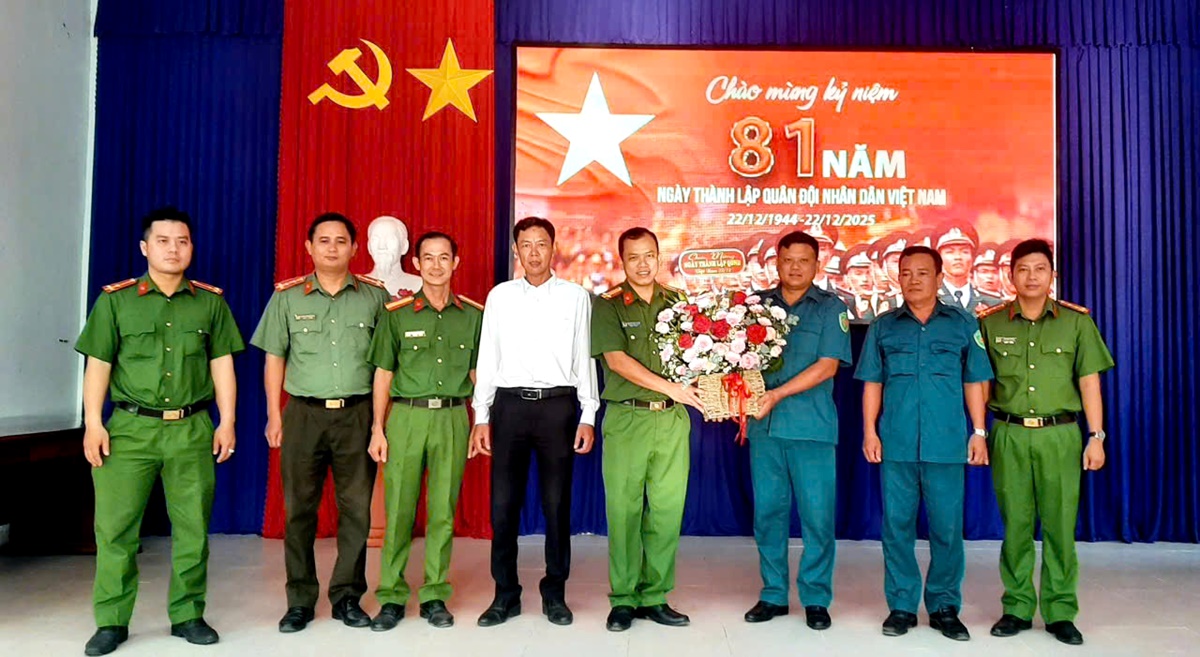 Công an xã cũng đến thăm và có lẳng hoa chúc mừng BCH Quân sự xã Thạnh Đức nhân 81 năm Ngày thành lập Quân đội Nhân dân Việt Nam.