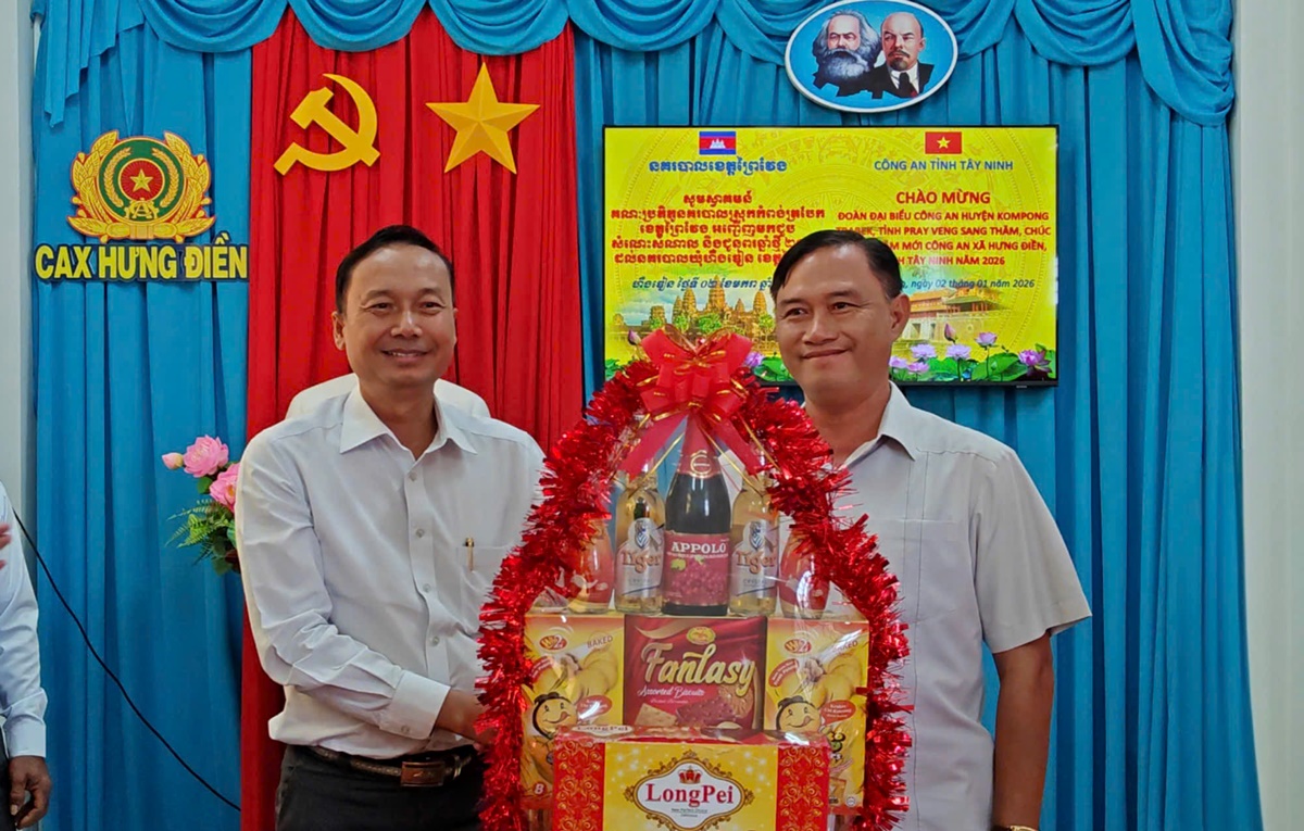 Nhân dịp đầu năm mới 2026, trong không khí thắm tình hữu nghị láng giềng, Đoàn đại biểu Công an huyện Kompong Trabek (tỉnh Pray Veng, Vương quốc Campuchia) do Đại tá Suôn Som Ươn - Trưởng Công an huyện làm Trưởng đoàn vừa sang thăm và chúc mừng năm mới lực lượng Công an xã Hưng Điền.