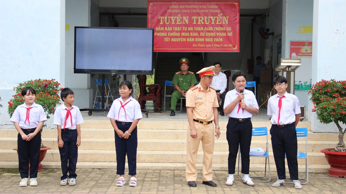 Ngày 05/01/2026, Phòng Cảnh sát giao thông Công an tỉnh phối hợp với Công an phường Hoà Thành, tỉnh Tây Ninh tổ chức tuyên truyền bảo đảm trật tự an toàn giao thông và phòng chống mua bán, sử dụng pháo nổ Tết Nguyên đán Bính Ngọ 2026 cho học sinh trường THCS Trần Bình Trọng.
