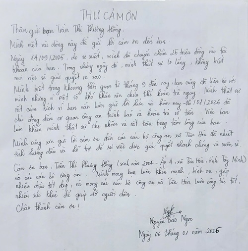 Trước đó, khoảng 10 giờ ngày 06/01/2025, chị Trần Thị Phương Hồng (22 tuổi, ngụ xã Tân Hoà, tỉnh Tây Ninh) đến Công an xã Tân Hòa trình báo có người sử dụng tài khoản MoMo chuyển tiền nhầm vào số tài khoản ngân hàng Vietinbank của chị số tiền 25 triệu đồng nên đến Công an xã trình báo để hoàn trả lại tiền chủ sở hữu. Nhận được thông tin, Công an xã đã xác minh và xác định chị Nguyễn Bảo Ngọc, trú tại tỉnh Thái Nguyên, là chủ tài khoản MoMo đã chuyển tiền nhầm cho chị Hồng. Công an xã Tân Hòa đã hướng dẫn chị Hồng hoàn trả tiền lại cho chủ sở hữu theo quy định. Sau đó, chị Ngọc đã viết thư cảm ơn chị Hồng cùng lực lượng Công an xã giúp chị nhận lại số tiền chuyển nhầm.