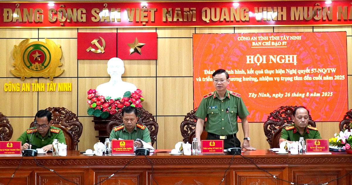Thiếu tướng Vũ Như Hà - Giám đốc Công an tỉnh phát biểu chỉ đạo tại Hội nghị đánh giá tình hình, kết quả thực hiện Nghị quyết số 57-NQ/TW và triển khai phương hướng, nhiệm vụ cuối năm 2025.