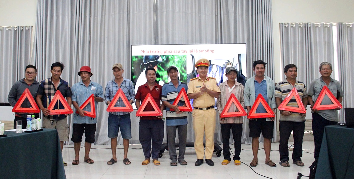 Nhân dịp, Phòng Cảnh sát giao thông cũng trao tặng cho các lái xe 10 tấm phản quang dừng đỗ xe an toàn; dán decal phản quang cho xe vận chuyển mía.
