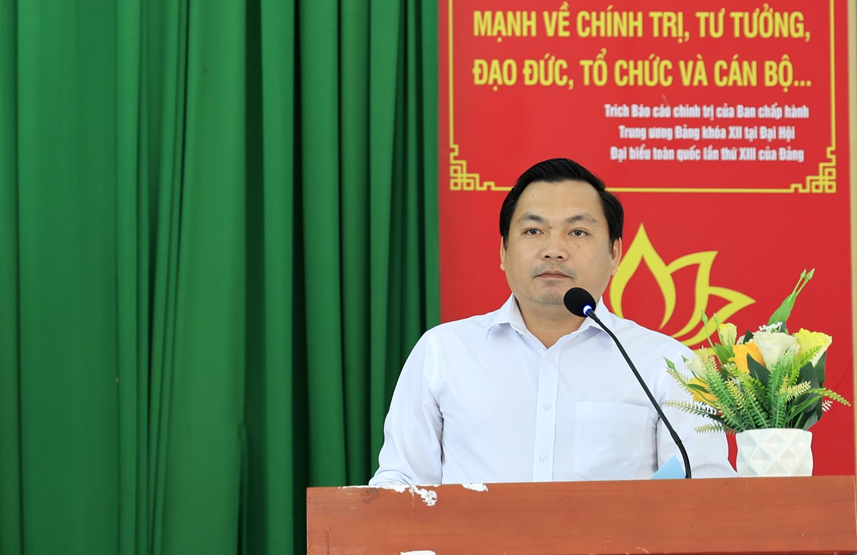 Đồng chí Nguyễn Minh Châu - Chủ tịch UBND xã phát biểu tại hội nghị.