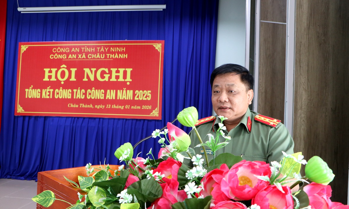 Phát biểu chỉ đạo hội nghị, đồng chí Đại tá Lê Văn Thuận, Phó Giám đốc Công an tỉnh đã ghi nhận, biểu dương những kết quả, thành tích mà Công an xã Châu Thành đã đạt được trong năm 2025 và đề nghị trong năm 2026, Công an xã tiếp tục bám sát sự lãnh đạo của Đảng uỷ, Ban Giám đốc Công an tỉnh và chính quyền địa phương chủ động nắm chắc tình hình từ sớm, từ xa, tập trung đấu tranh hiệu quả với các loại tội phạm, bảo đảm tốt an ninh trật tự dịp Tết Nguyên đán Bính Ngọ năm 2026 và các sự kiện chính trị, văn hóa của tỉnh diễn ra trên địa bàn xã. Tổ chức thực hiện nghiêm túc, hiệu quả các đợt cao điểm tấn công, trấn áp tội phạm, bảo đảm an ninh, trật tự, phục vụ Đại hội đại biểu toàn quốc lần thứ XIV của Đảng, bầu cử đại biểu Quốc hội và Hội đồng nhân dân các cấp nhiệm kỳ 2026 - 2031…