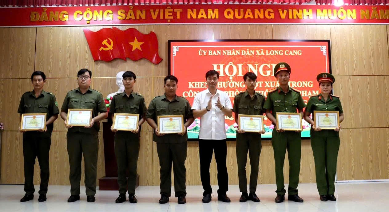 Tại buổi Lễ, đồng chí Nguyễn Khắc Hoàng Nguyên - Phó Chủ tịch UBND xã đã trao Giấy khen đột xuất cho tập thể Tổ phòng chống tội phạm Công an xã Long Cang và 07 cá nhân gồm: Thiếu tá Huỳnh Thị Tuyết Nhung, Thiếu tá Võ Thanh Sang - Công an xã Long Cang và ông Hồ Thanh Tùng - Tổ An ninh trật tự ấp 3, ông Nguyễn Minh Khôi - Tổ An ninh trật tự ấp 4, ông Nguyễn Thanh Phong - Tổ An ninh trật tự ấp 2, ông Nguyễn Thanh Liêm - Tổ An ninh trật tự ấp 13 và ông Nguyễn Hoàng Rang - Tổ An ninh trật tự ấp 8, xã Long Cang có thành tích xuất sắc trong công tác đấu tranh, khám phá nhanh vụ trộm cắp tài sản.