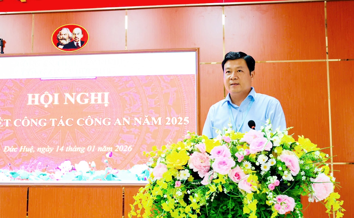 Chiều ngày 14/01/2026, Công an xã Đức Huệ tổ chức Hội nghị tổng kết công tác Công an năm 2025. Đến dự và chỉ đạo tại hội nghị có đồng chí Đào Ngọc Thanh - Bí thư Đảng ủy, Chủ tịch HĐND xã Đức Huệ; đồng chí Phạm Thị Châu Hoàng - Phó Bí thư thường trực Đảng ủy xã; đồng chí Nguyễn Văn Suôn - Phó Bí thư Đảng ủy, Chủ tịch UBND xã; đồng chí Võ Thị Hồng Gấm- Ủy viên Ban thường vụ Đảng ủy xã, Phó Chủ tịch HĐND xã; đồng chí Nguyễn Văn Cường - Ủy viên Ban thường vụ Đảng ủy xã, Chủ tịch UBMTTQVN xã; các đồng chí là lãnh đạo các Phòng, ban, đoàn thể xã, BCH Quân sự xã. Thiếu tá Cao Văn Vũ - Trưởng Công an xã chủ trì hội nghị.