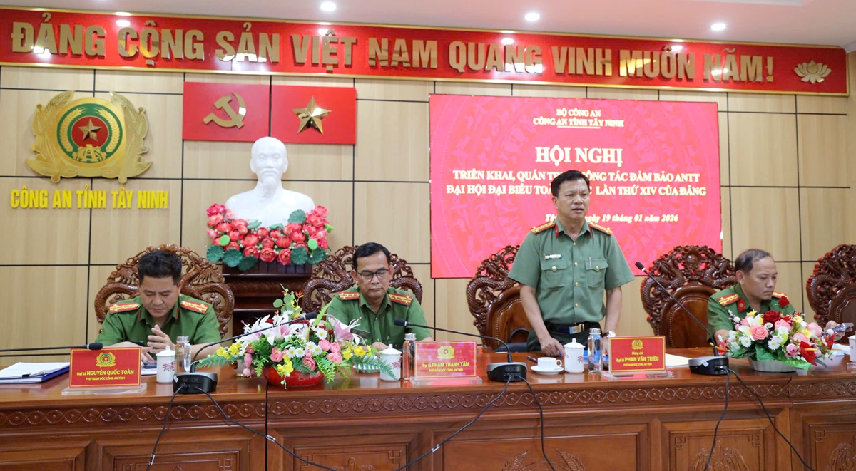 Nhằm bảo đảm tuyệt đối an ninh, an toàn trước, trong và sau Đại hội đại biểu toàn quốc của Đảng, ngày 19/01/2026, Công an tỉnh Tây Ninh tổ chức triển khai thực hiện công tác bảo đảm an ninh, trật tự (ANTT) phục vụ Đại hội đại biểu toàn quốc lần thứ XIV của Đảng. Đại tá Phan Văn Triều - Phó Bí thư Đảng ủy, Phó Giám đốc Công an tỉnh chủ trì cuộc họp.