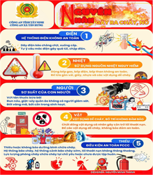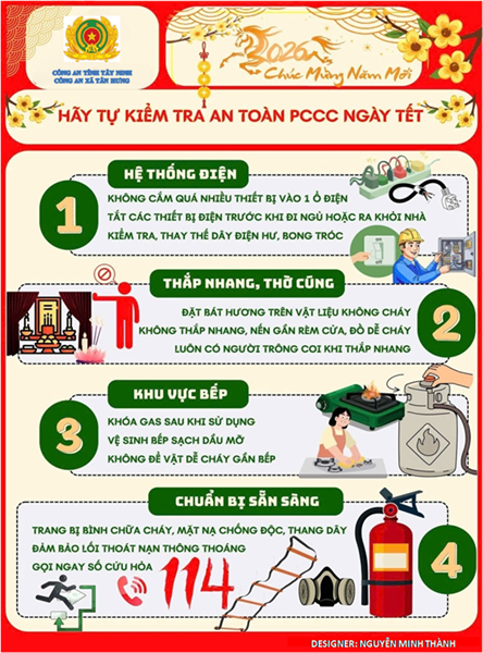 Nhằm chủ động tuyên truyền, nâng cao ý thức và bảo đảm tuyệt đối an toàn công tác phòng cháy, chữa cháy và cứu nạn, cứu hộ (PCCC&CNCH) trước, trong và sau Tết Nguyên đán Bính Ngọ năm 2026, đặc biệt trong thời gian Đại hội đại biểu toàn quốc lần thứ XIV, bầu cử đại biểu Quốc hội khóa XVI và HĐND các cấp lần thứ XIV nhiệm kỳ 2026-2031, Công an xã Tân Hưng, tỉnh Tây Ninh vừ phát hành 03 infographic tuyên truyền với nội dung trọng tâm, thiết thực, người dân dễ tiếp cận.