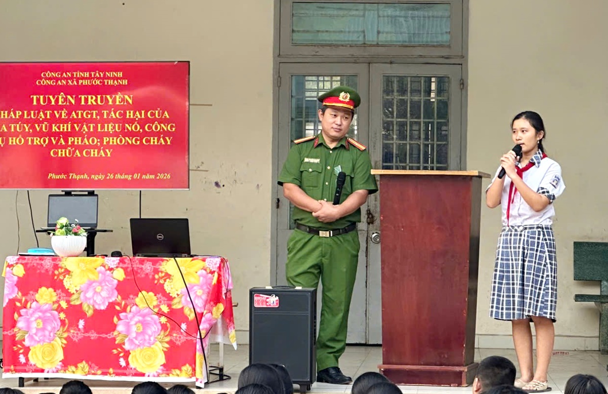 Thực hiện kế hoạch cao điểm tấn công, trấn áp tội phạm, lập thành tích chào mừng sự thành công của Đại hội đại biểu lần thứ XIV của Đảng; cuộc bầu cử đại biểu Quốc hội khóa XVI, đại biểu HĐND các cấp nhiệm kỳ 2026 - 2031, Tết Nguyên đán Bính Ngọ năm 2026, Công an xã Phước Thạnh vừa phối hợp Ban giám hiệu các trường THCS trên địa bàn tổ chức tuyên truyền, phổ biến pháp luật về trật tự, an toàn giao thông đường bộ; tác hại của ma túy; tuyên truyền pháp luật về vũ khí vật liệu nổ, công cụ hỗ trợ và pháo; công tác phòng cháy, chữa cháy cho học sinh, giáo viên tại các Trường THCS trên địa bàn.