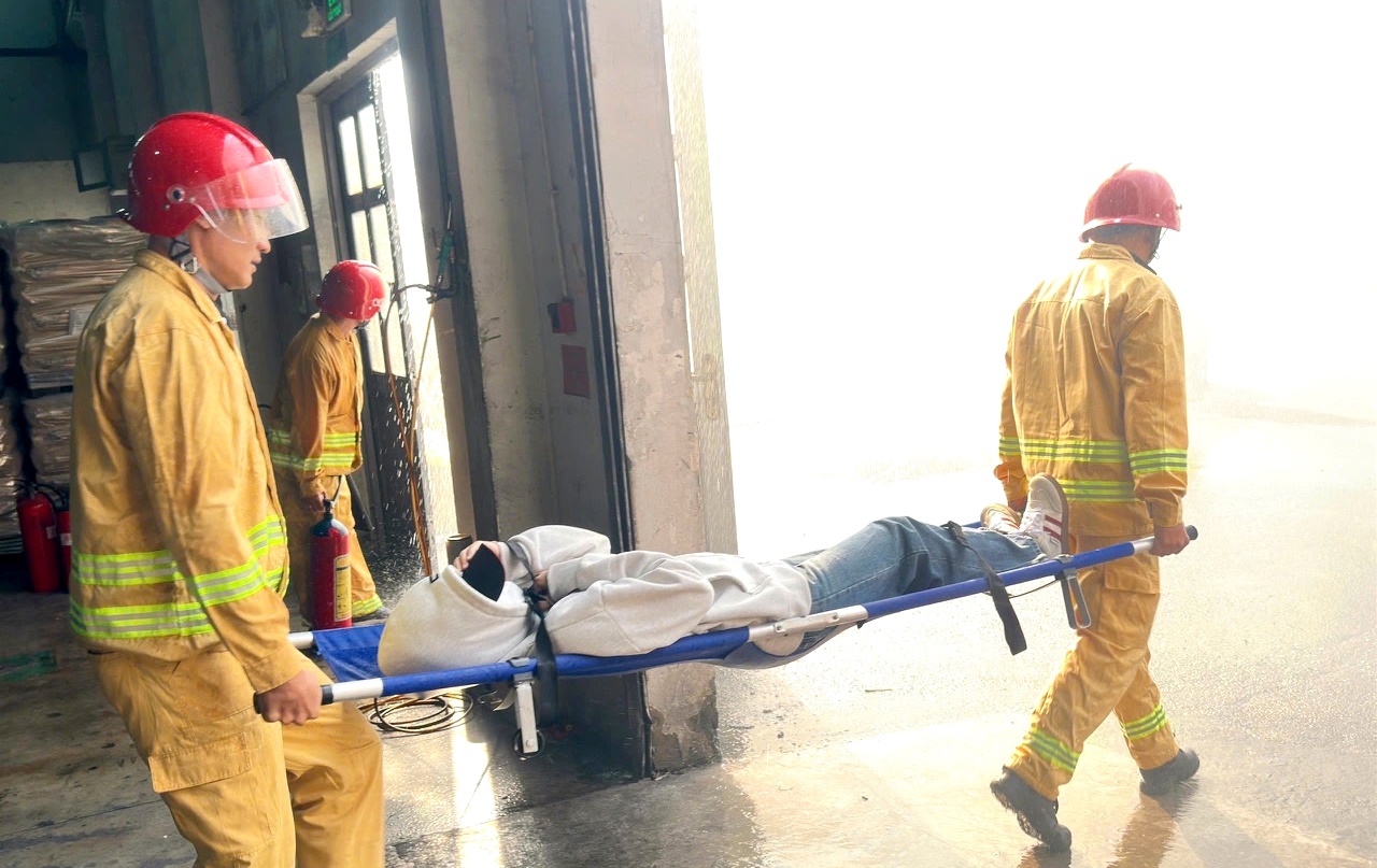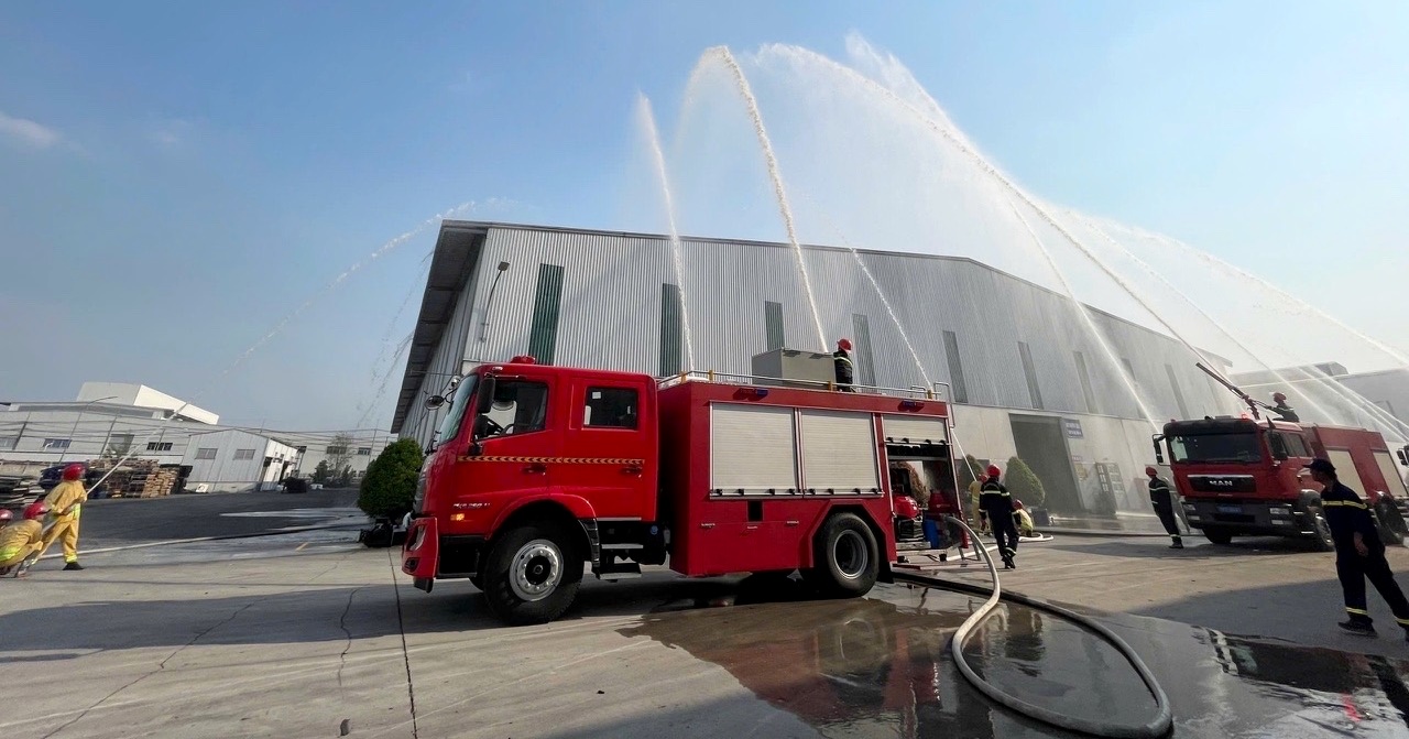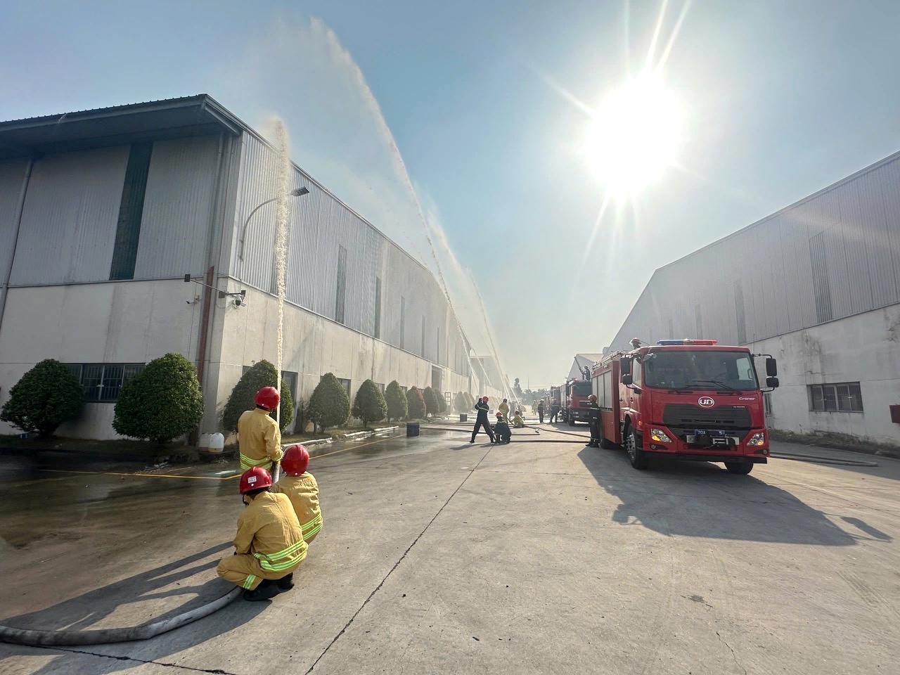 Tình huống giả định xảy ra cháy tại nhà kho nguyên liệu, nguyên nhân cháy được đưa ra là do chập điện, có nguy cơ lan rộng ra các khu vực lân cận. Ngay khi phát hiện đám cháy, lực lượng PCCC cơ sở đã nhanh chóng báo động, kích hoạt hệ thống báo cháy và sử dụng bình chữa cháy tại chỗ để dập tắt ngọn lửa ban đầu.
