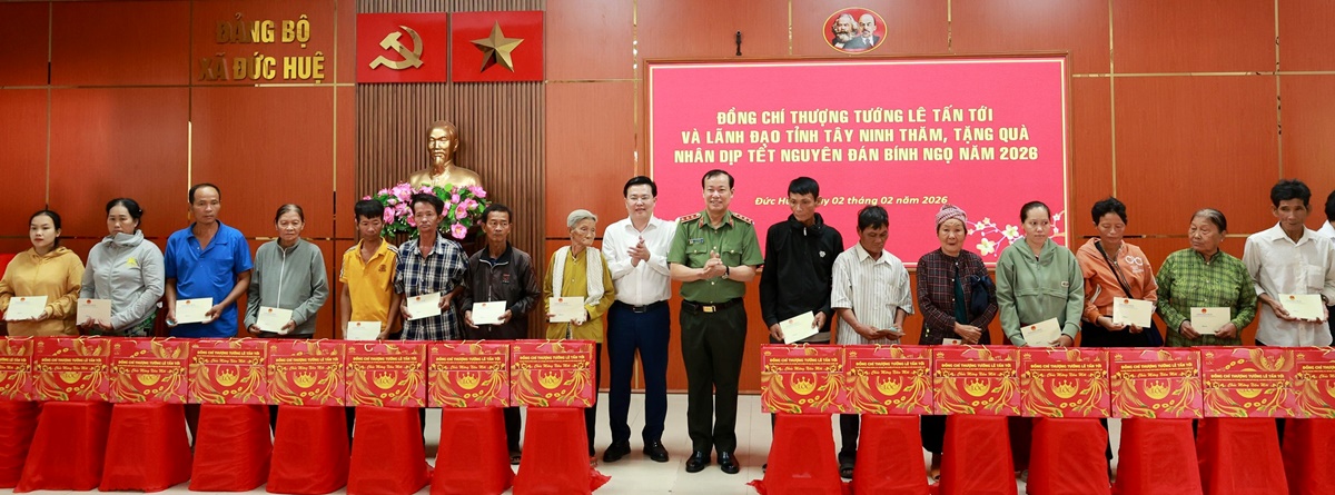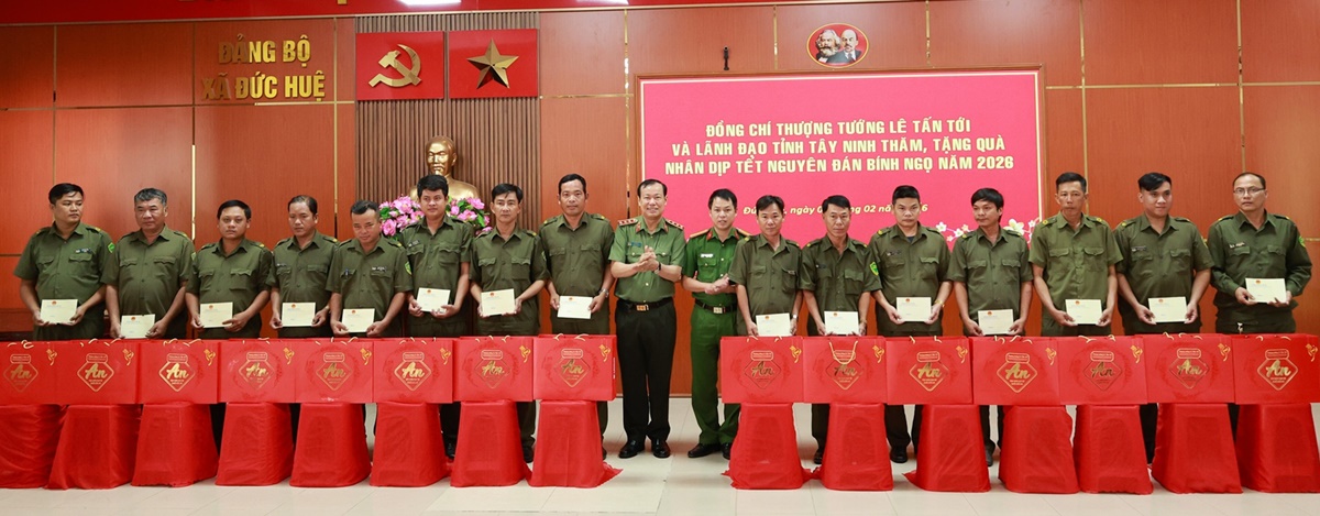 Ngày 02/02, tại hội trường Trung tâm xã Đức Huệ, Thượng tướng Lê Tấn Tới- Ủy viên Ban Chấp hành Trung ương Đảng, Ủy viên Ban Thường vụ Quốc hội, Chủ nhiệm Ủy ban Quốc phòng, An ninh và Đối ngoại của Quốc hội đến thăm, tặng quà cho hộ nghèo, hộ cận nghèo, các đồng chí lực lượng an ninh trật tự cơ sở, dân quân thường trực trên địa bàn xã Đức Huệ nhân dịp Tết Nguyên đán Bính Ngọ năm 2026.