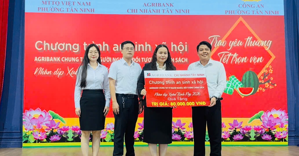 Nhân dịp Tết Nguyên đán Xuân Bính Ngọ 2026, Công an phường Tân Ninh phối hợp Ủy ban Mặt trận Tổ quốc Việt Nam phường Tân Ninh và Ngân hàng Nông nghiệp và Phát triển nông thôn Việt Nam (Agribank) Chi nhánh Tây Ninh tổ chức chương trình “Trao yêu thương - Tết trọn vẹn”.