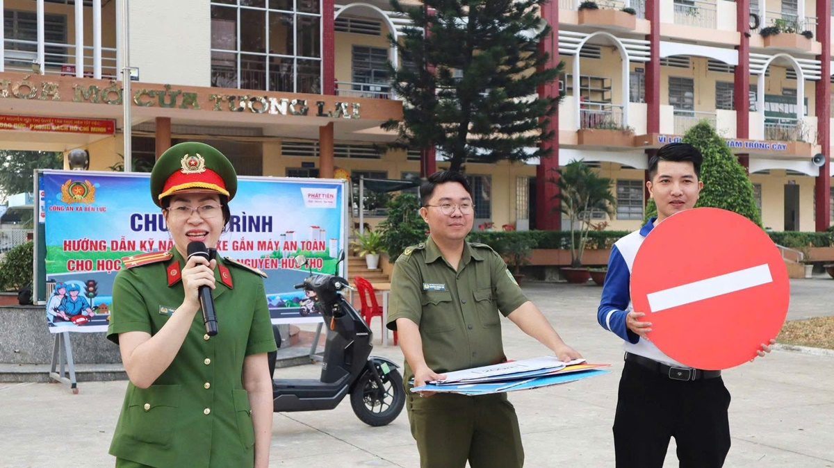 Công an xã Bến Lức tuyên truyền, phổ biến pháp luật về ATGT và hướng dẫn kỹ năng lái xe gắn máy an toàn cho học sinh