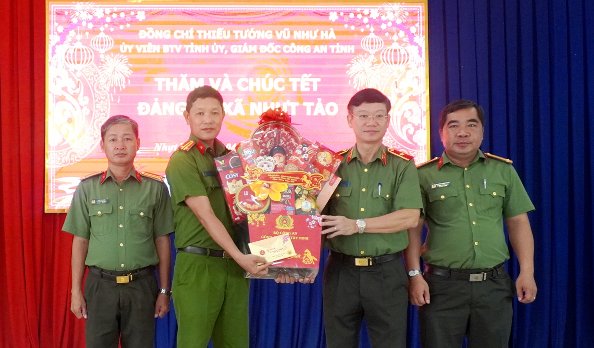 Tiếp đó, Đoàn công tác đến thăm, chúc Tết Đảng bộ, chính quyền, nhân dân và Công an xã Nhựt Tảo. Thay mặt lãnh đạo tỉnh, Thiếu tướng Vũ Như Hà ghi nhận và đánh giá cao những kết quả mà địa phương đạt được trong năm qua, đặc biệt là trong công tác bảo đảm an ninh, trật tự, phát triển kinh tế – xã hội và chăm lo đời sống nhân dân. Đồng chí đề nghị cấp ủy, chính quyền và lực lượng Công an xã tiếp tục phát huy tinh thần đoàn kết, chủ động nắm chắc tình hình, triển khai đồng bộ, hiệu quả các biện pháp công tác, bảo đảm để nhân dân vui Xuân, đón Tết an toàn, lành mạnh.