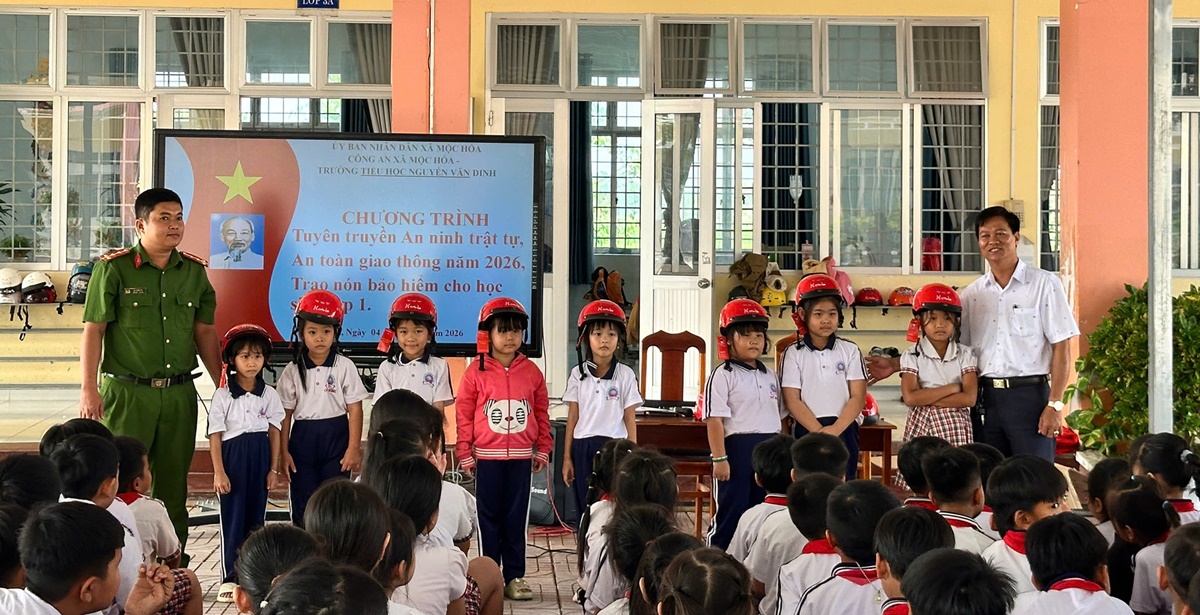 Nhân dịp này, Công an xã Mộc Hóa còn phối hợp với cửa hàng HEAD Honda trao tặng 90 nón bảo hiểm cho học sinh khối lớp 1. Đây không chỉ là món quà thiết thực mà còn là thông điệp nhắc nhở các em hình thành thói quen đội mũ bảo hiểm khi tham gia giao thông, bảo vệ an toàn cho chính mình.