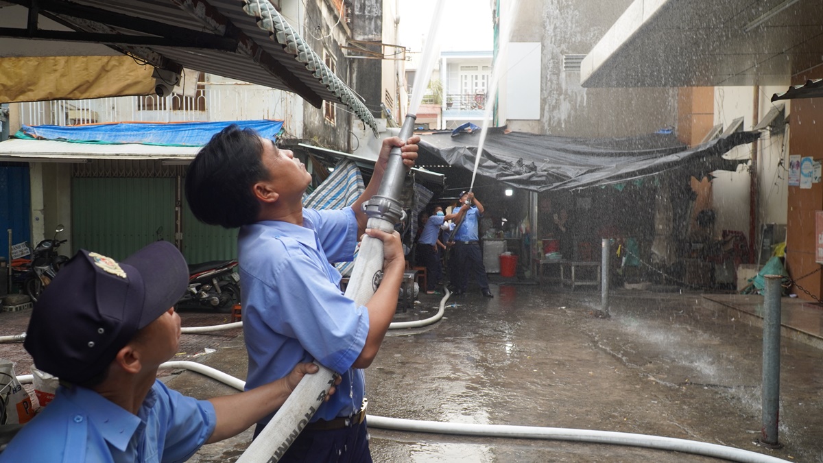 Theo tình huống giả định, đám cháy xảy ra tại khu vực kinh doanh trong chợ, có nguy cơ cháy lan, gây thiệt hại lớn về tài sản và đe dọa an toàn tính mạng người dân. Ngay khi chuông báo cháy vang lên, lực lượng PCCC cơ sở nhanh chóng tổ chức báo động, triển khai chữa cháy ban đầu, hướng dẫn tiểu thương thoát nạn, cứu người bị nạn và di chuyển tài sản ra khu vực an toàn. Lực lượng Cảnh sát PCCC và CNCH kịp thời có mặt, triển khai đội hình, tổ chức trinh sát, cứu nạn, cứu hộ và khống chế đám cháy theo đúng quy trình nghiệp vụ.