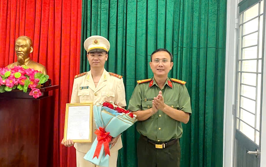 Tại buổi lễ, thừa ủy quyền của Giám đốc Công an tỉnh, Thượng tá Nguyễn Phước Hòa - Trưởng phòng Tổ chức cán bộ công bố và trao quyết định điều động Đại úy Lâm Văn Lập - Phó Trưởng Công an phường Khánh Hậu đến nhận công tác và giữ chức vụ Phó Trưởng Công an xã Bình Thành.