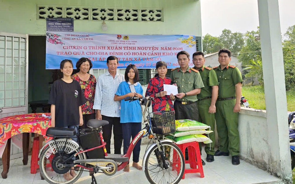 Chi đoàn cơ sở Công an xã Vàm Cỏ đã vận động mạnh thường quân trao tặng 01 xe đạp điện trị giá 4.000.000 đồng cho em Đặng Thị Thu Hương, nhằm hỗ trợ phương tiện đi học; đồng thời trao 30 kg gạo và 01 phần tiền mặt trị giá 2.000.000 đồng hỗ trợ gia đình bà Đặng Thị Kim Thoa, ngụ ấp Nhựt Tân, xã Vàm Cỏ.
