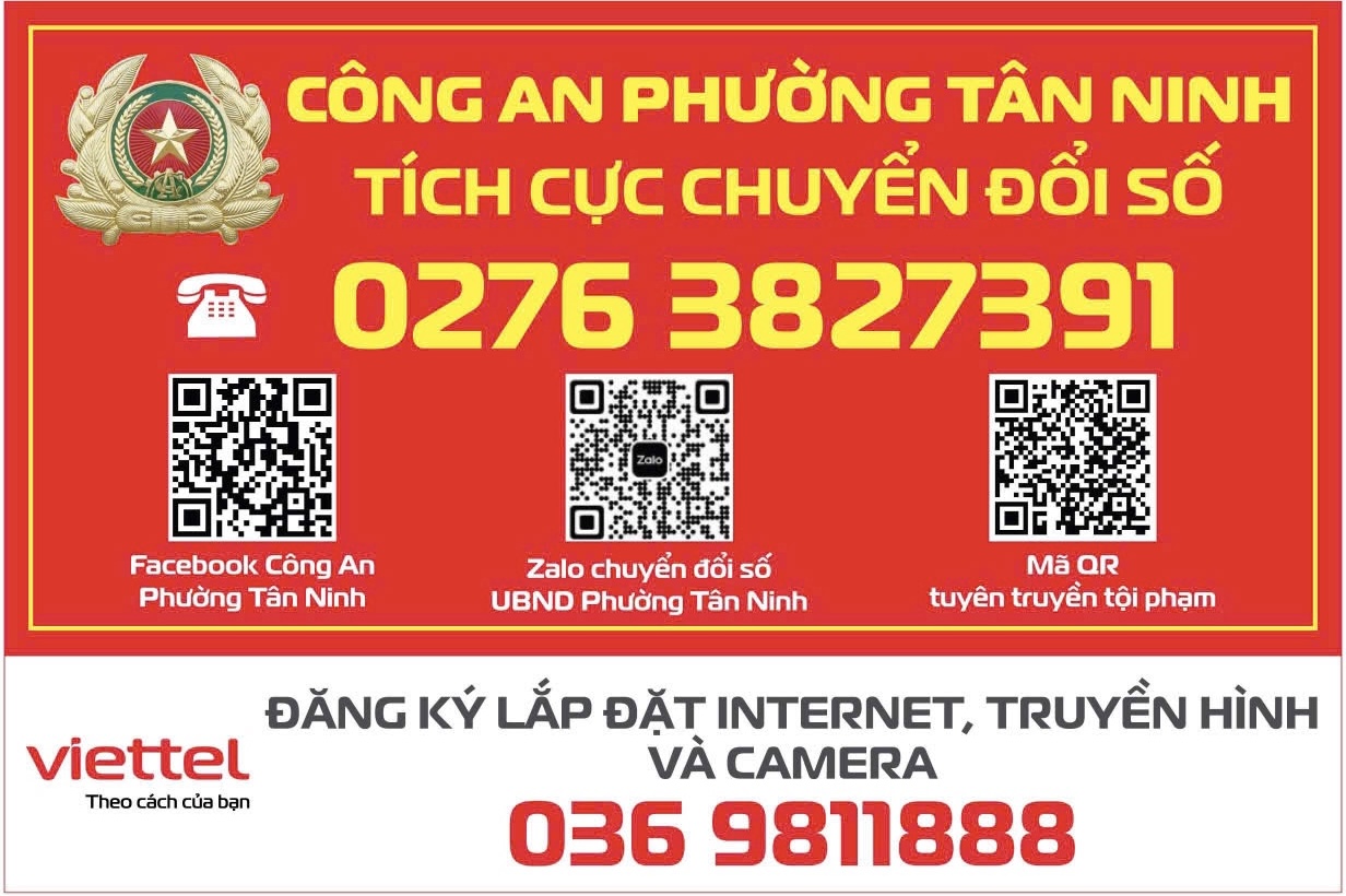 Trước đó, sáng ngày 09/02/2026, Công an phường Tân Ninh đã phối hợp với Chi nhánh Viettel Tây Ninh tổ chức Lễ ra quân tuyên truyền công tác chuyển đổi số, phòng, chống tội phạm đến các hộ dân trên địa bàn phường. Lực lượng Công an đã trực tiếp tuyên truyền tại các tuyến đường, khu dân cư, cơ sở kinh doanh; đồng thời dán bảng FORMAT in số điện thoại trực ban Công an phường, mã QR liên kết đến Trang Fanpage Công an phường, Zalo Chuyển đổi số UBND phường Tân Ninh cùng các thông tin tuyên truyền về phòng, chống tội phạm.