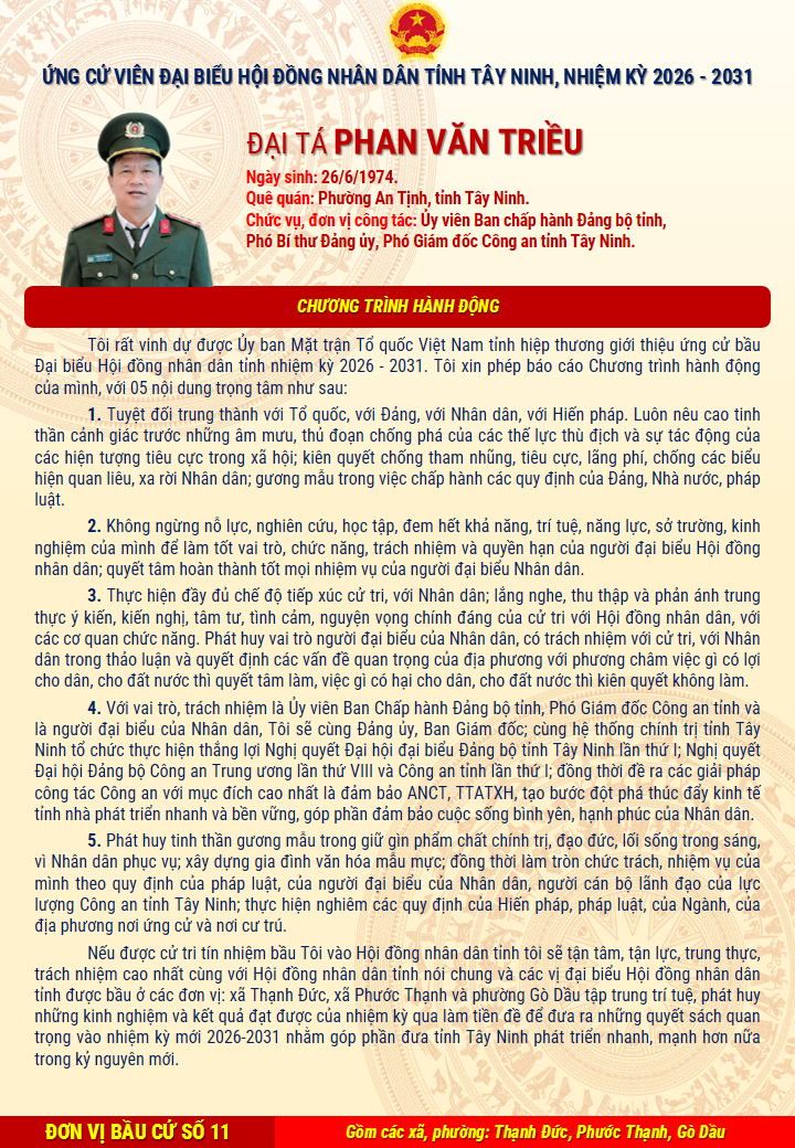 Được giới thiệu ứng cử đại biểu HĐND tỉnh Tây Ninh nhiệm kỳ 2026 - 2031, Đại tá Phan Văn Triều xác định đây là niềm vinh dự, đồng thời là trách nhiệm lớn trước cử tri và Nhân dân trong tỉnh. Với kinh nghiệm thực tiễn phong phú, tinh thần trách nhiệm và sự tận tụy trong công tác, đồng chí sẽ là cầu nối vững chắc giữa ý chí, nguyện vọng chính đáng của cử tri với HĐND tỉnh, góp phần xây dựng quê hương Tây Ninh ngày càng phát triển, ổn định, bình yên và giàu đẹp./.