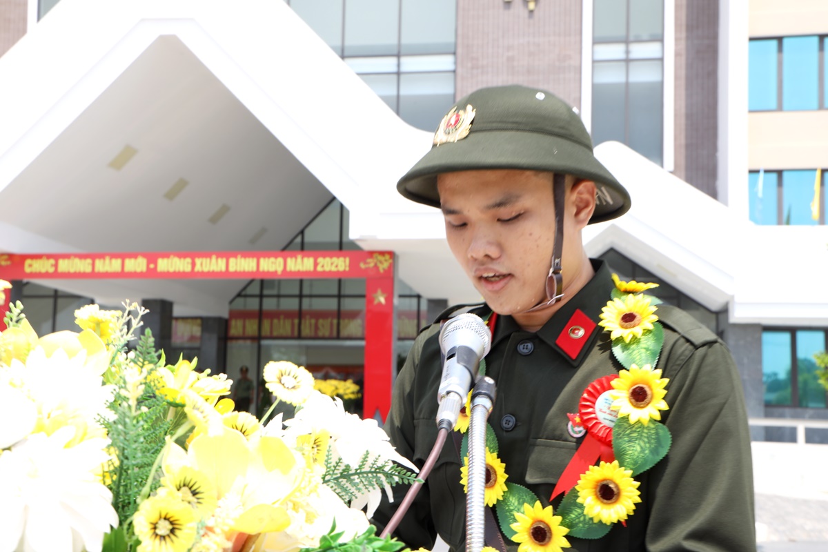 Cũng trong không khí vui tươi, phấn khởi của buổi Lễ giao nhận công dân thực hiện nghĩa vụ tham gia Công an nhân dân năm 2026, công dân Trần Nam Phát đại diện cho 792 thanh niên bày tỏ quyết tâm khi được vinh dự phục vụ trong lực lượng Công an nhân dân: “Là thế hệ thanh niên được sinh ra và lớn lên trong thời kỳ đất nước hòa bình, phát triển; chúng cháu rất biết ơn các thế hệ đi trước đã chiến đấu, hy sinh anh dũng để giành độc lập cho dân tộc. Để tiếp nối truyền thống hào hùng của dân tộc, của lực lượng Công an nhân dân anh hùng; chúng cháu đã tự nguyện đăng ký phục vụ trong lực lượng Công an nhân dân, nhằm góp phần đảm bảo an ninh, trật tự, đem lại cuộc sống bình yên, hạnh phúc cho nhân dân. Được tuyển chọn phục vụ trong lực lượng Công an nhân dân là niềm vinh dự, tự hào không cho riêng bản thân của chúng cháu mà còn là niềm tự hào và hạnh phúc của những người thân trong gia đình. Để xứng đáng với niềm tin của các cấp lãnh đạo, chúng cháu xin hứa: Nghiêm túc tiếp thu lời căn dặn của lãnh đạo Công an tỉnh, chấp hành nghiêm Điều lệnh CAND, nội quy, quy chế học tập, quy trình huấn luyện trong Công an nhân dân. Quyết tâm khắc phục, nhanh chóng vượt qua khó khăn, bỡ ngỡ ban đầu để hòa nhập vào môi trường quân ngũ, thích nghi với môi trường học tập, rèn luyện, công tác trong lực lượng Công an nhân dân; luôn hòa đồng tập thể, đoàn kết thương yêu, giúp nhau cùng tiến bộ. Phấn đấu tự học tập, tu dưỡng, rèn luyện bản lĩnh chính trị, phẩm chất đạo đức, lối sống, phát huy tinh thần xung kích, sáng tạo của tuổi trẻ, sẵn sàng nhận và hoàn thành tốt mọi nhiệm vụ được giao”.