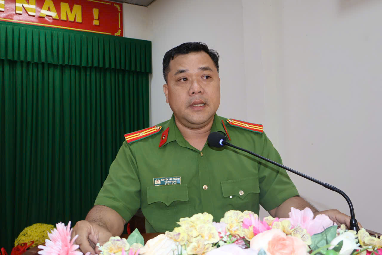 Thiếu tá Nguyễn Văn Trường - Trưởng Công an xã báo cáo kết quả hoạt động năm 2025 và triển khai phương hướng, nhiệm vụ năm 2026 đối với lực lượng tham gia bảo vệ an ninh, trật tự ở cơ sở trên địa bàn.