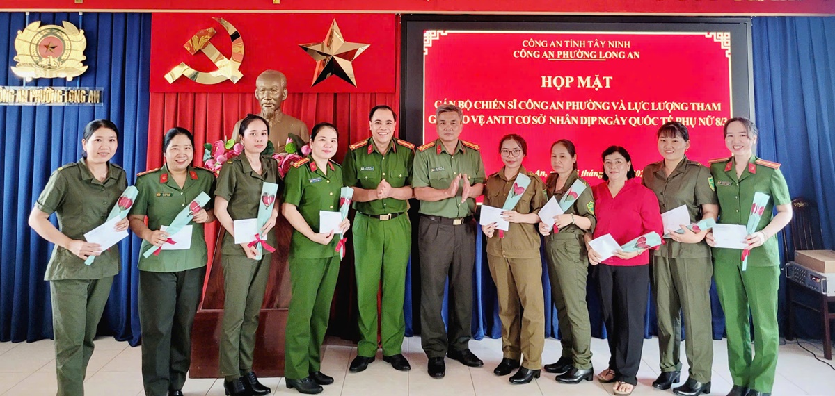 Ngày 05/3/2026, Công an phường Long An long trọng tổ chức buổi họp mặt nhân dịp kỷ niệm Ngày Quốc tế Phụ nữ 8/3. Tham dự buổi họp mặt có Thượng tá Võ Văn Hết - Trưởng Công an phường cùng Ban Chỉ huy, cán bộ chiến sĩ Công an phường và lực lượng tham gia bảo vệ an ninh trật tự ở cơ sở.