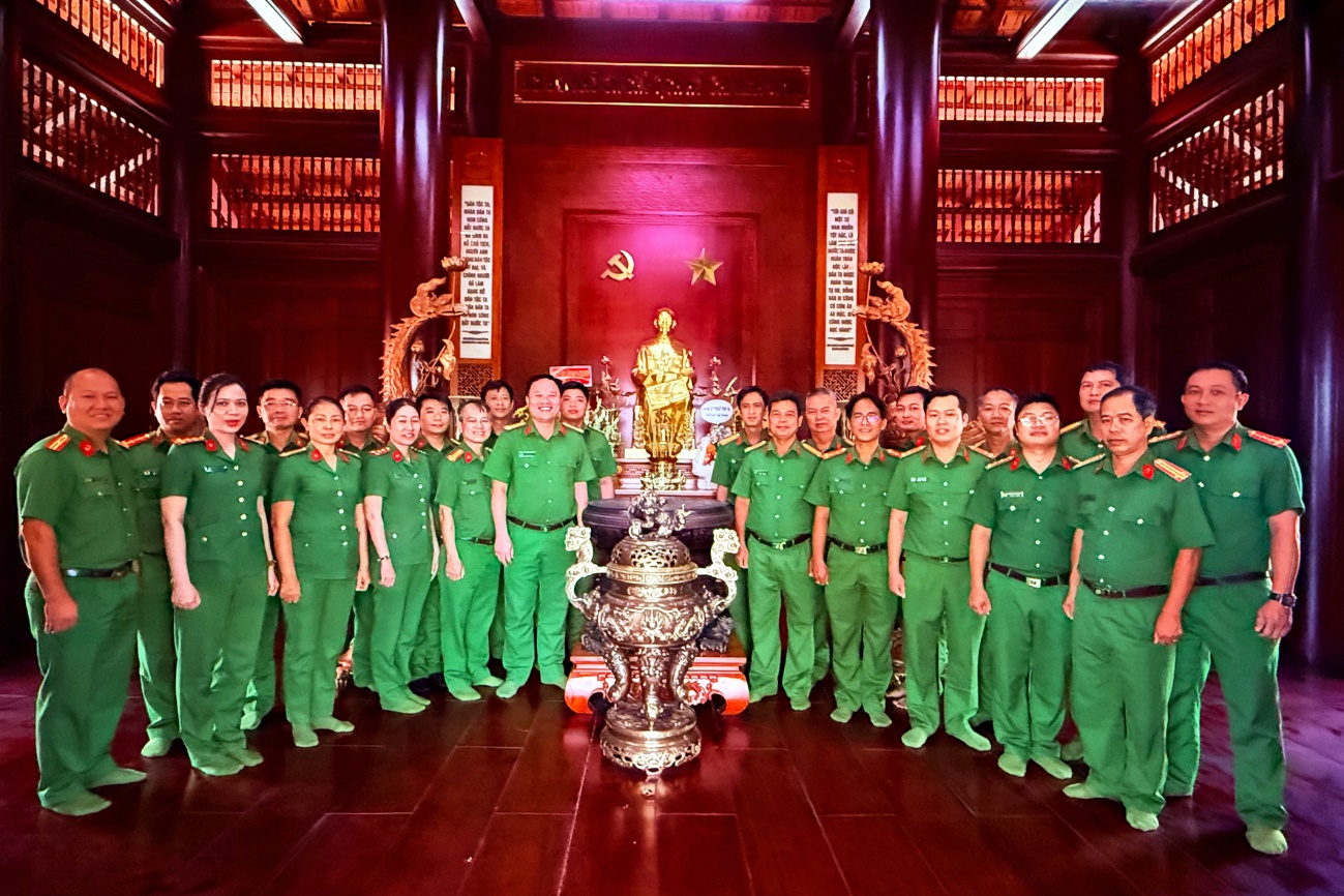Tập thể lãnh đạo, chỉ huy và cán bộ, chiến sĩ Phòng Kỹ thuật hình sự Công an tỉnh Tây Ninh chụp ảnh lưu niệm tại Khu lưu niệm Chủ tịch Hồ Chí Minh.