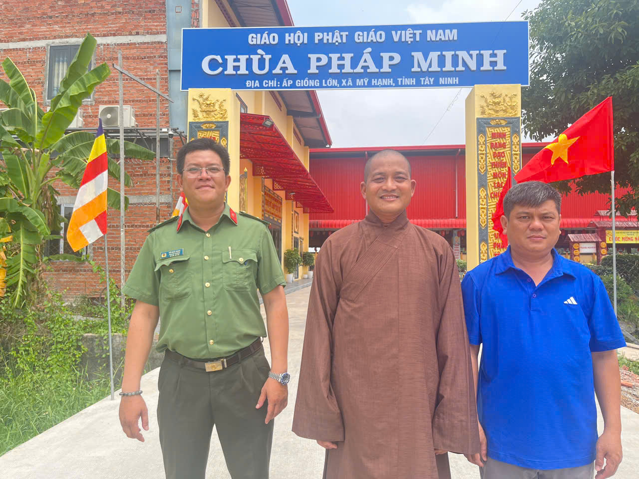 Cán bộ Phòng An ninh nội địa vận động treo cờ Tổ quốc tại chùa Pháp Minh (xã Mỹ Hạnh).