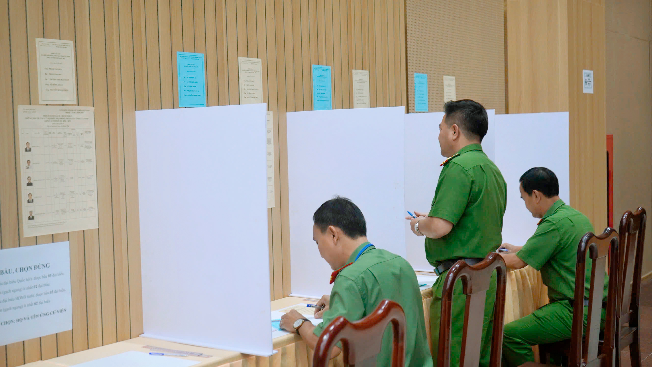 Ngay sau lễ khai mạc và kiểm tra hòm phiếu theo quy định, các cử tri đã lần lượt thực hiện quyền bầu cử của mình trong không khí nghiêm túc, dân chủ, đúng trình tự. Trong không khí phấn khởi tin tưởng của toàn Đảng, toàn dân và toàn quân, các cử tri là cán bộ, chiến sĩ Công an tỉnh Tây Ninh đã tham gia bỏ phiếu bầu cử để thực hiện quyền và nghĩa vụ công dân.