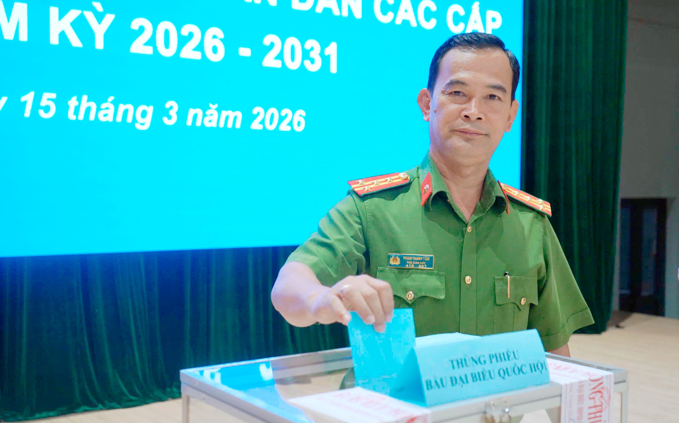 Đại tá Phạm Thanh Tâm - Phó Giám đốc Công an tỉnh thực hiện quyền bầu cử tại Tổ bầu cử số 47 Công an tỉnh Tây Ninh.