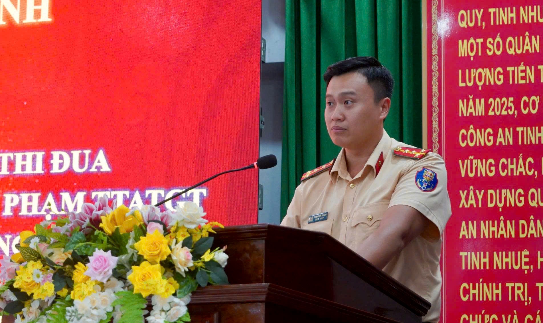 Đại úy Trịnh Quốc Khánh - Bí thư Đoàn Cơ sở Phòng Cảnh sát giao thông phát biểu nhận nhiệm vụ.
