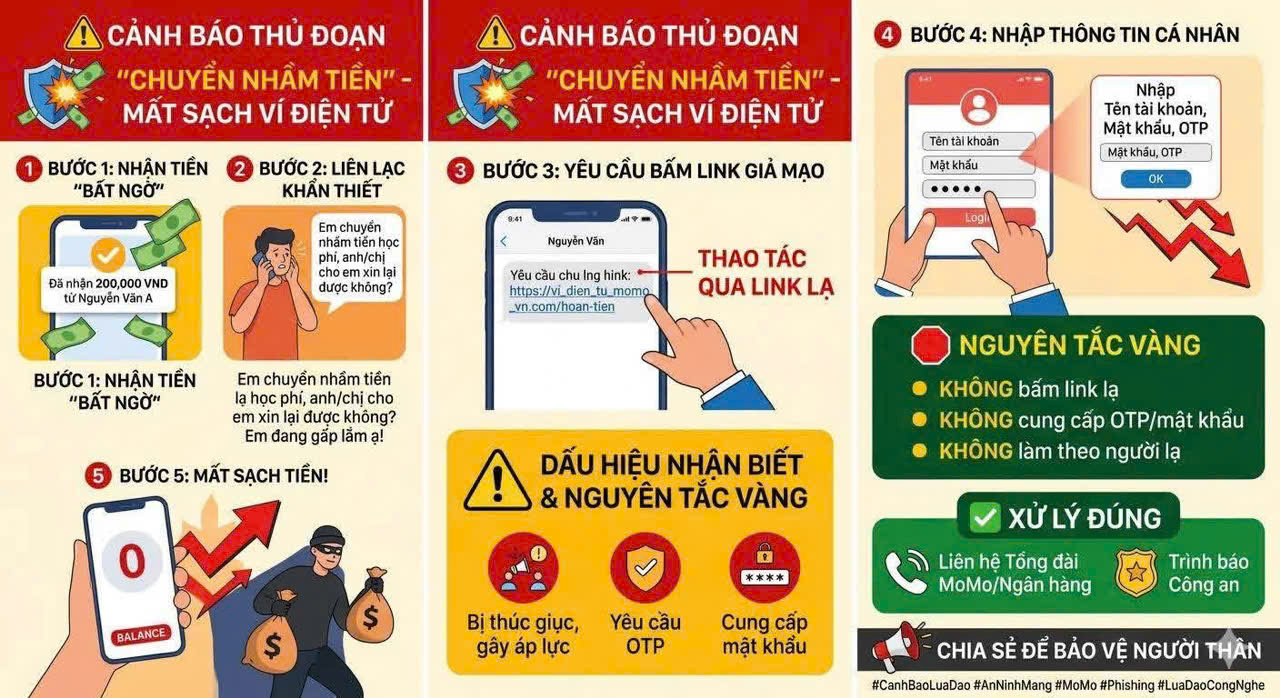 Qua các vụ việc đã xảy ra, có thể nhận diện thủ đoạn này thông qua một số dấu hiệu như: nhận được tiền từ người lạ kèm theo yêu cầu xử lý thông qua đường link; đối tượng liên tục thúc giục, tạo áp lực về thời gian; hoặc yêu cầu cung cấp các thông tin bảo mật như mật khẩu, mã OTP.