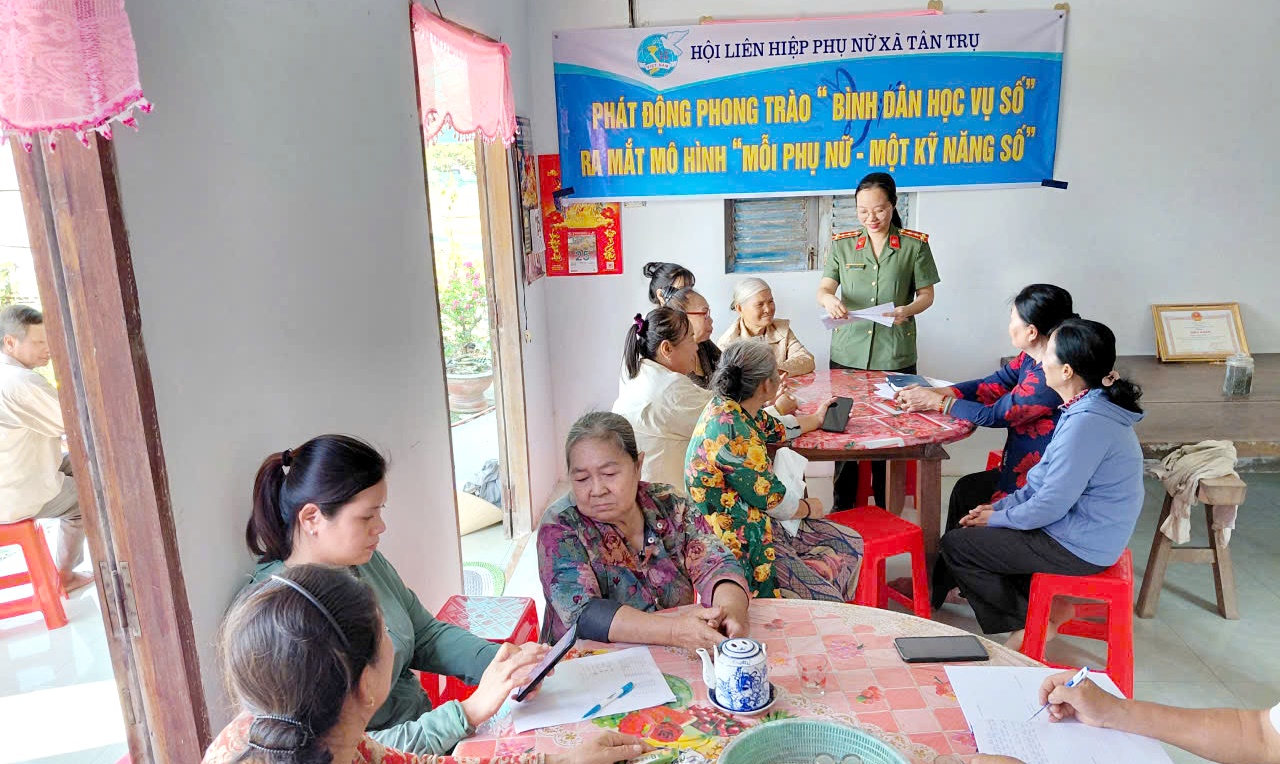 Nhằm đẩy mạnh công tác chuyển đổi số tại cơ sở, phát huy vai trò nòng cốt của phụ nữ trong thời đại công nghệ, Chi hội Phụ nữ Công an xã Tân Trụ đã phối hợp với Hội Liên hiệp Phụ nữ xã tổ chức phát động phong trào “Bình dân học vụ số” và ra mắt mô hình “Mỗi phụ nữ - một kỹ năng số”. Buổi phát động có sự tham gia của đồng chí Trương Thị Tuyết Mai - Chủ tịch Hội Phụ nữ xã Tân Trụ, Đại uý Võ Thị Cẩm Nhung - Chi hội Trưởng Chi hội Phụ nữ Công an xã, cùng với sự tham gia của 20 hội viên phụ nữ tại ấp Tân Bình.