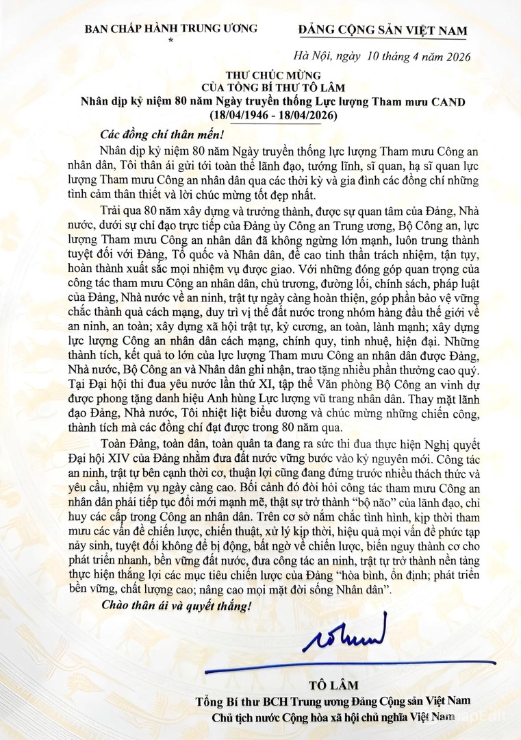 Thư chúc mừng của Tổng Bí thư, Chủ tịch nước Tô Lâm nhân dịp kỷ niệm 80 năm Ngày truyền thống lực lượng Tham mưu CAND