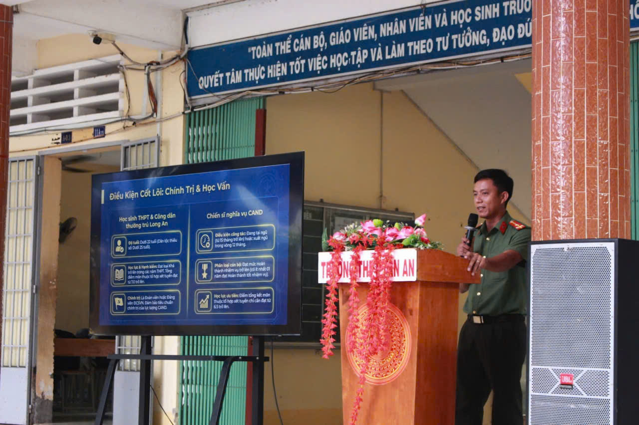 Ảnh: Cán bộ tuyển sinh Công an phường Long An tuyên truyền tại trường THPT Tân An.