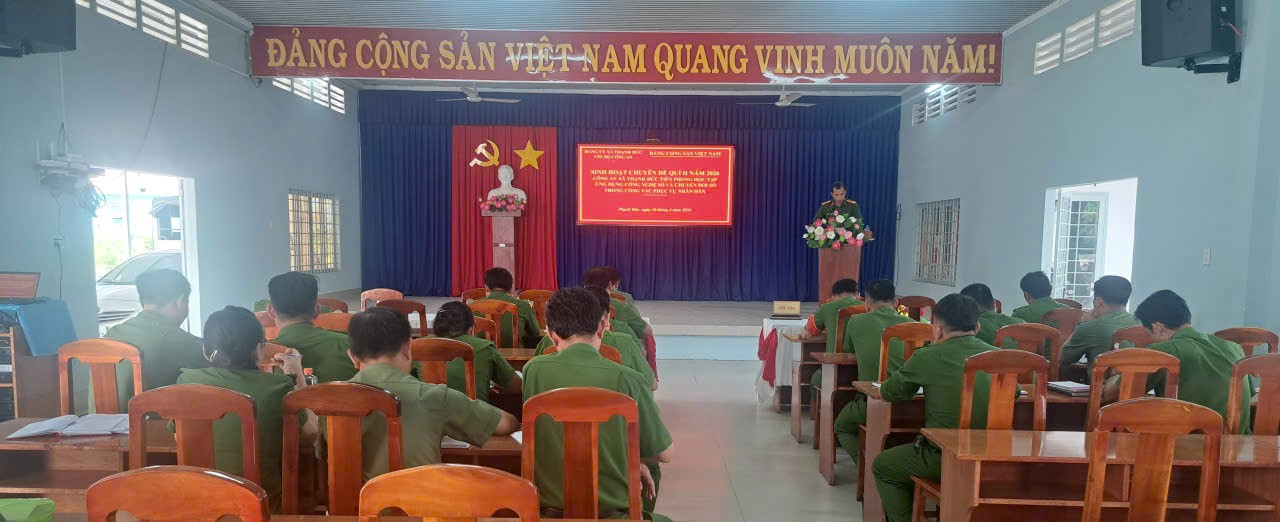 Ngày 10/4/2026, Công an xã Thạnh Đức tổ chức Sinh hoạt chuyên đề Quý II/2026 với nội dung Công an xã Thạnh Đức tiên phong học tập ứng dụng công nghệ số và chuyển đổi số trong công tác phục vụ nhân dân.