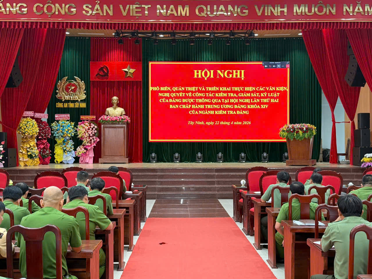 Sáng ngày 22/4/2026, Đảng ủy Công an tỉnh Tây Ninh tổ chức Hội nghị trực tuyến phổ biến, quán triệt và triển khai thực hiện nghị quyết, chương trình hành động và quy định mới của Trung ương về công tác kiểm tra, giám sát và kỷ luật của Đảng theo Kế hoạch số 13-KH/UBKTTW, ngày 13/4/2026 của Ủy ban Kiểm tra Trung ương; Giấy mời số 37-GM/UBKTTU, ngày 17/4/2026 của Ủy ban Kiểm tra Tỉnh ủy và Công văn số 462-CV/UBKT, ngày 21/4/2026 của Ủy ban Kiểm tra Đảng ủy Công an Trung ương.