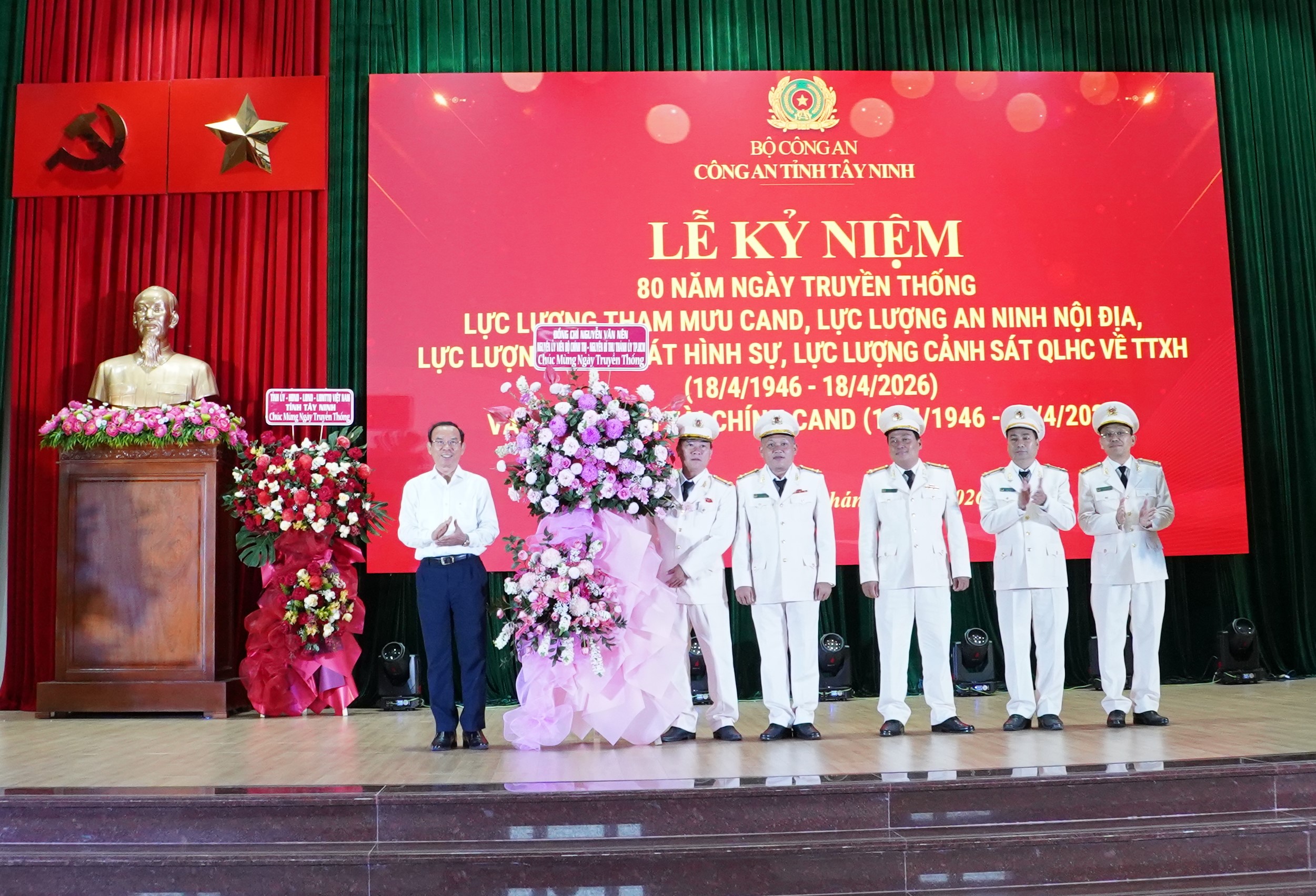 Chiều ngày 22/4/2026, Công an tỉnh Tây Ninh đã trang trọng tổ chức Lễ kỷ niệm 80 năm Ngày truyền thống lực lượng Tham mưu CAND, lực lượng An ninh nội địa, lực lượng Cảnh sát hình sự, lực lượng Cảnh sát Quản lý hành chính về trật tự xã hội (18/4/1946 – 18/4/2026) và lực lượng Tài chính CAND (17/4/1946 – 17/4/2026).